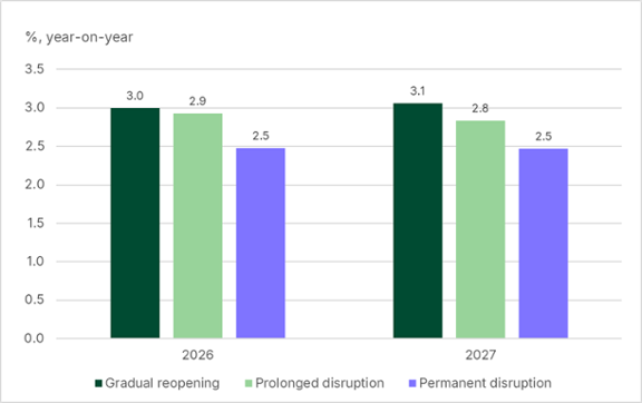 For the global economy, a gradual reopening would have only a minor effect on growth in 2026 and 2027, keeping it broadly in line with the pace of recent years (see Figure 10). Under prolonged disruption, global growth slows modestly, cushioned by fiscal support of around 0.5 percent of GDP. In the permanent disruption scenario, even stronger fiscal measures cannot prevent growth from falling to levels that are by some definitions consistent with a global recession.