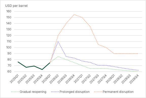 - Permanent disruption: The conflict escalates into a broader war, including attacks on regional energy infrastructure and possible US ground involvement. Although hostilities end late in the year, Iranian control of the Strait persists, and normal flows resume only gradually during 2027. We assume oil, gas and agricultural raw materials prices peak in Q4 2026, while the investment premium rises permanently by 3 percent.