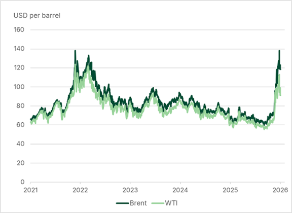 As a result of the war, global oil and gas prices have risen sharply (Figures 1 and 2). Oil prices briefly approached levels seen during the 2022 energy crisis, while European gas prices remain well below those peaks. At first sight, net energy exporters not directly affected by the conflict, such as the US, Canada, Brazil, Australia, Indonesia and Russia, seem relatively insulated and may even benefit compared to net importers.