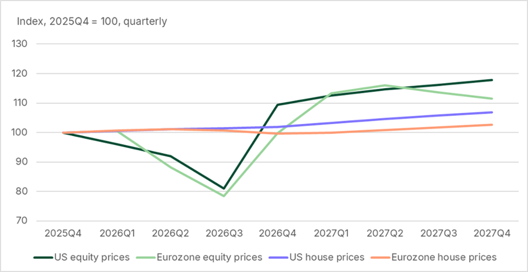 - Gradual reopening: The truce evolves into lasting peace, with the Strait gradually reopening during April and early May. We assume that oil, gas and agricultural raw material prices peak in Q2 and return to their pre-war levels by the end of the year. To model a global confidence shock we increase the investment premium by 0.5 percent with elevation lingering until mid-2027 due to the elevated uncertainty and caution.