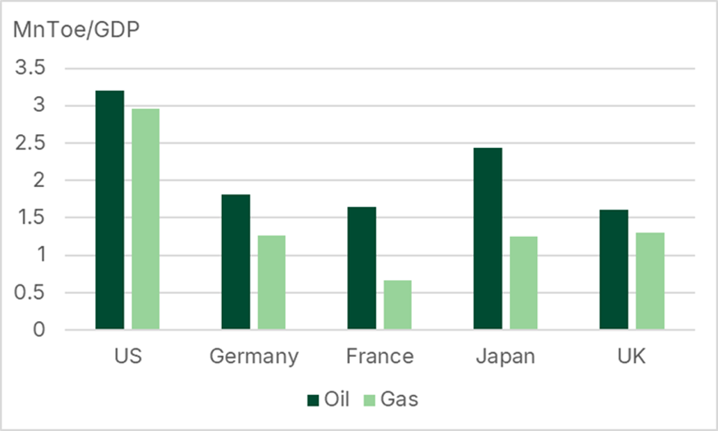 Despite these differences, the inflationary impact of the shock in 2026 is broadly similar across major advanced economies, with differences in headline inflation arising mostly from different pre-war starting positions (see Figure 4). The similar impact partly reflects the relatively high fossil fuel intensity of the US economy (see Figure 5), but also differences in import structures and price transmission. In the US, energy imports, which are dominated by oil, form a relatively large share of total imports (despite it being a net exporter), and domestic prices respond quickly to global changes. In Europe, energy is a smaller share of imports, and price pass-through is somewhat weaker, particularly in the UK. Japan has the highest share of energy in total imports, but its reliance on imported coal and slower price transmission dampen the immediate impact.